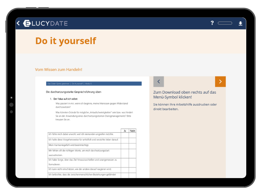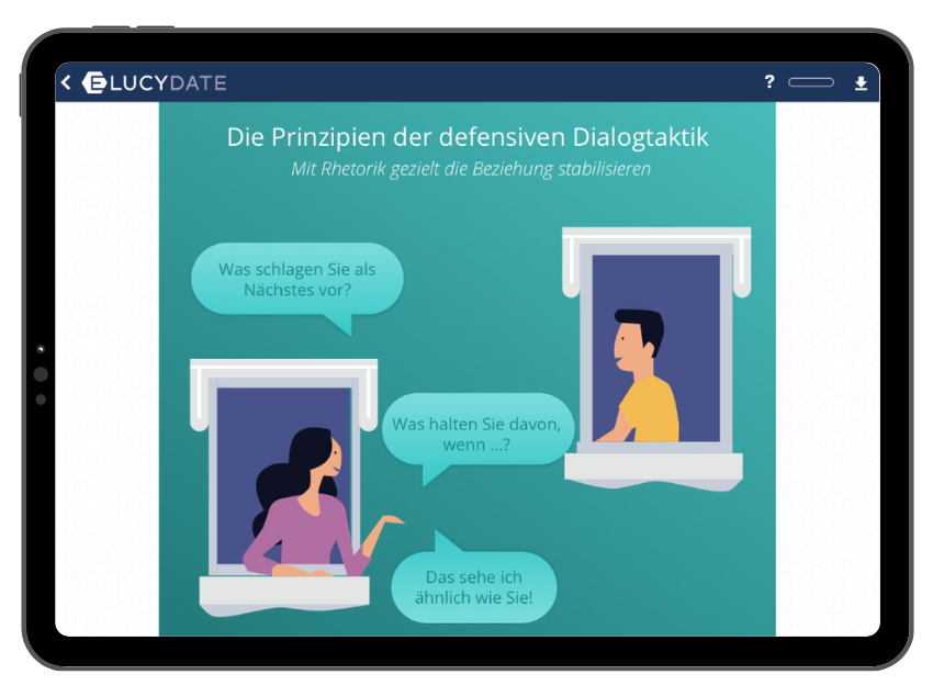 In unserem E-Learning-Kurs „Das Outer-Game gewinnen“ lernst du, wie du mit Strategie und Taktik überzeugst – ob defensiv, kooperativ oder durchsetzungsstark. Außerdem erfährst du, wie du deine Dialogtechnik an unterschiedliche Gesprächssituationen anpasst und deine Wirkung gezielt steuerst.