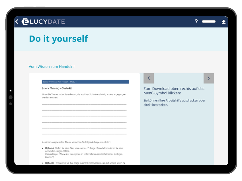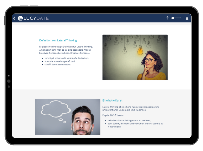 In unserem E-Learning-Kurs „Lateral Thinking“ entdeckst du, wie du Denkblockaden überwindest und mit unkonventionellen Methoden zu innovativen Ideen gelangst. Du erfährst, wie kreative Menschen ticken, was sie auszeichnet – und wie du ihre Denkweise für dich nutzen kannst. Die sogenannte „Fluchtmethode“ hilft dir dabei, dich bewusst von eingefahrenen Mustern zu lösen und neue Lösungsräume zu erschließen.