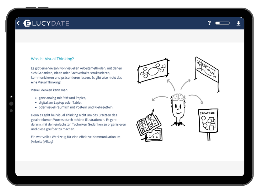 In unserem E-Learning-Kurs „Visual Thinking“ lernst du die Grundlagen dieser Technik kennen: von den ersten Schritten über die „Show & Tell“-Methode bis hin zur Anwendung in der Teamarbeit. Du erfährst, wie du mit einfachen visuellen Werkzeugen Klarheit schaffst und deine Kommunikation auf ein neues Level hebst.